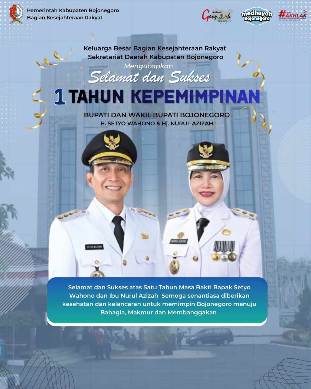 Ucapan selamat dan sukses atas satu tahun kepemimpinan ini juga menjadi bentuk apresiasi atas kerja keras, dedikasi, dan pengabdian yang telah diberikan. Semoga di tahun-tahun berikutnya, semakin banyak capaian positif yang dirasakan masyarakat, serta semakin kuat langkah dalam membangun Bojonegoro ke arah yang lebih baik.