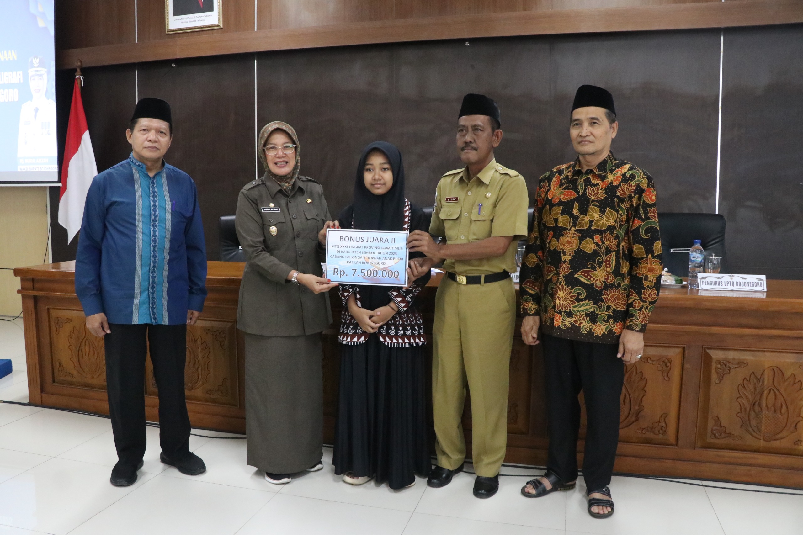 BOJONEGORO – Pemerintah Kabupaten Bojonegoro secara resmi menyerahkan bonus apresiasi kepada Ananda Qiana Arsyakaila Al Mufiq yang berhasil meraih Juara II pada ajang Musabaqah Tilawatil Quran (MTQ) Tingkat Provinsi Jawa Timur yang diselenggarakan di Kabupaten Jember pada Selasa (09/12/2025)